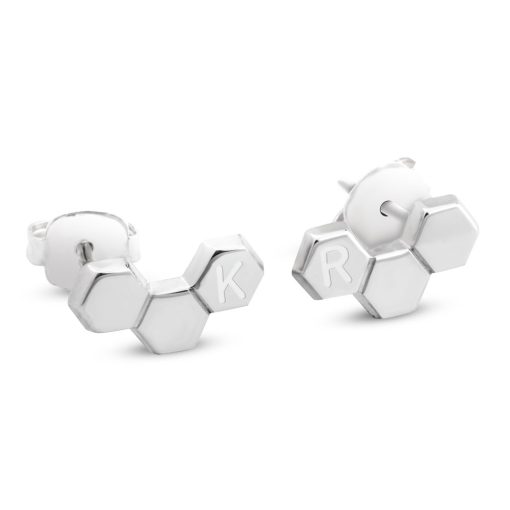 Disponible en argent massif ou en plaqué or jaune ou rose chaque boucle d’oreille représente une série de 3 petits hexagones dont l’un est personnalisé avec l’initiale de votre choix.