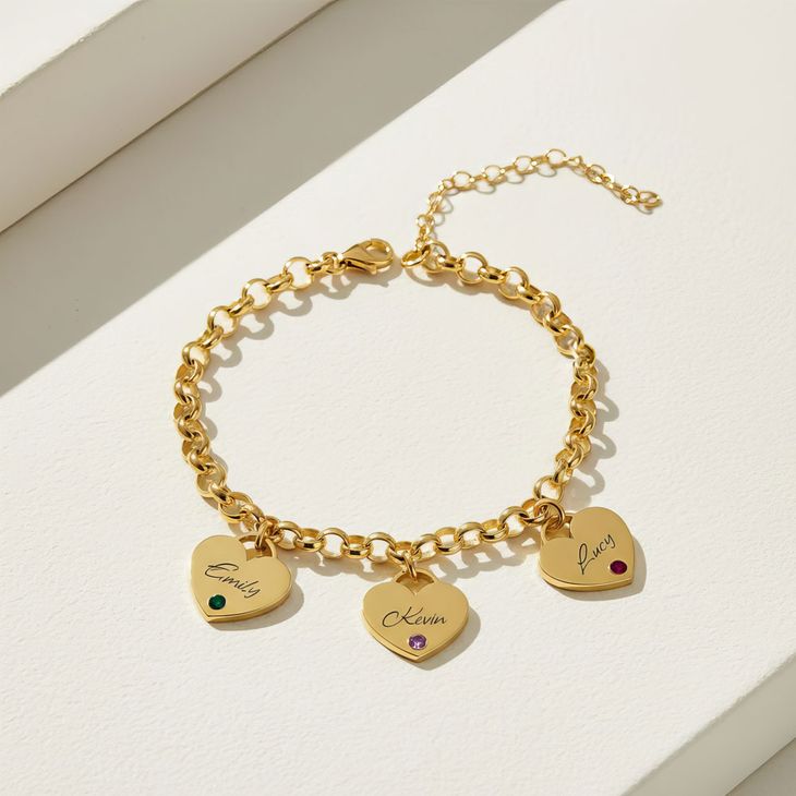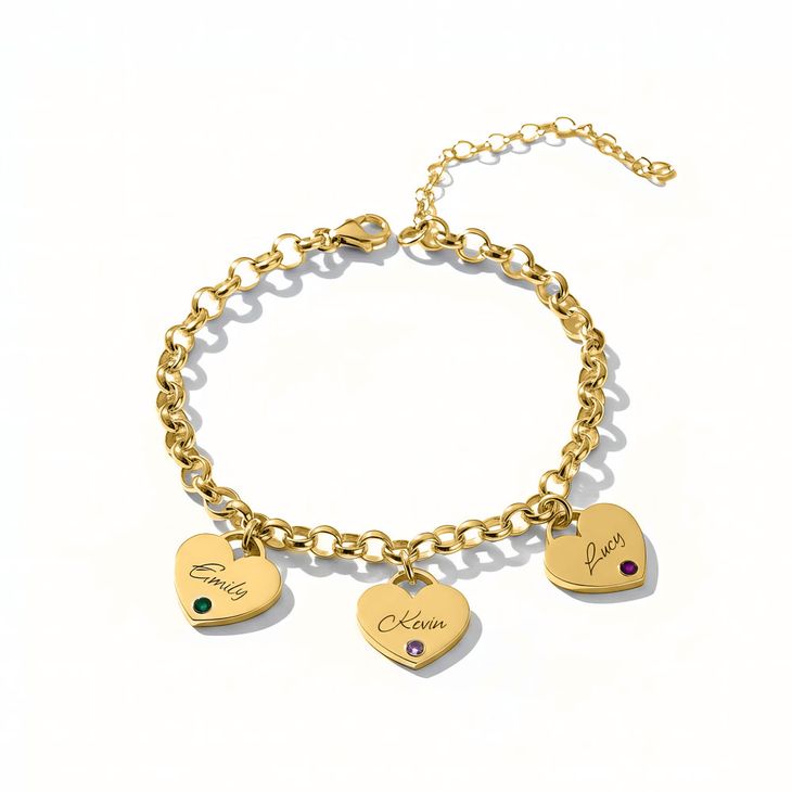 Bracelet avec Charms Cœurs Gravés et Pierres de Naissance