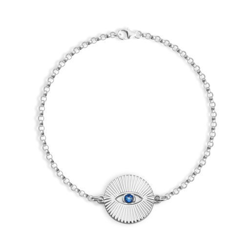 Un soleil éclatant, symbole de vitalité et de lumière orne le pendentif rond du bracelet. Au cœur de ce soleil se trouve un œil serti d’une pierre de naissance bleue. Ce dernier représente la protection spirituelle. Cette combinaison forte incarne la force intérieure et la sagesse nécessaire pour vivre serein.