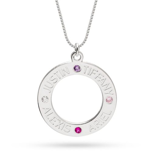 Le pendentif cercle, au design moderne et raffiné, est gravé finement des prénoms en lettres script et serti de pierres de naissance.