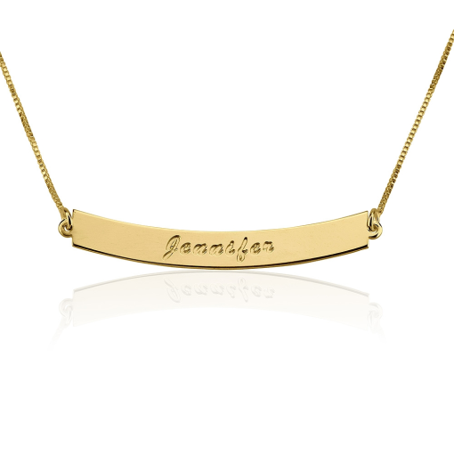 Pour personnaliser ce charmant collier barre fine incurvée c’est très simple, communiquez-nous le prénom ou le mot de votre choix et celui-ci sera gravé dans une police élégante au centre de la barre.