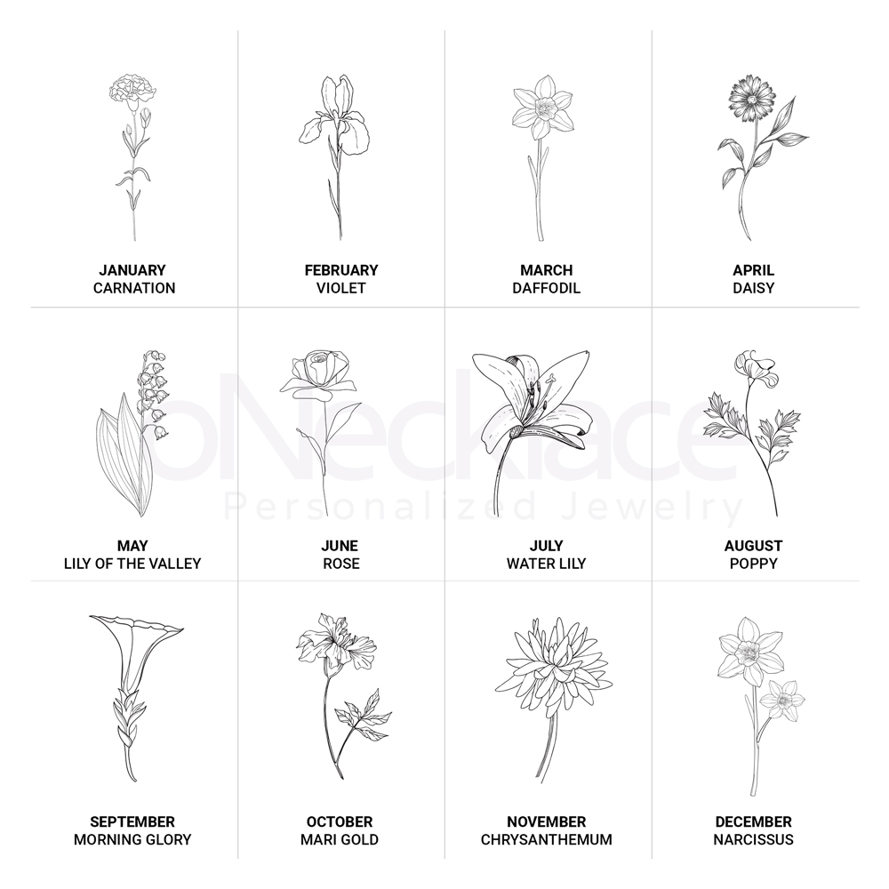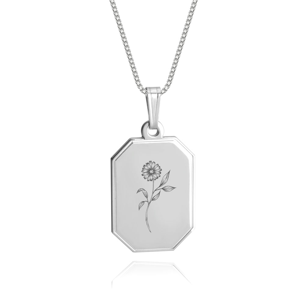 Il existe douze versions de ce collier fleur gravé au laser avec l’une des fleurs du mois. Chic et délicat, le pendentif de forme octogonale est finement encadré et gravé de la fleur choisie. Vous pouvez le faire graver au dos de mots tendres, prénoms ou dates préférés.