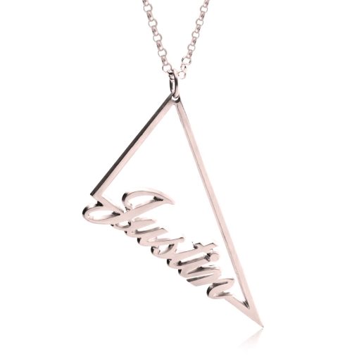 Disponible en argent massif ou en plaqué or jaune ou rose de belle qualité ce collier représente un triangle incrusté d’un prénom de votre choix écrit en jolies lettres cursives.